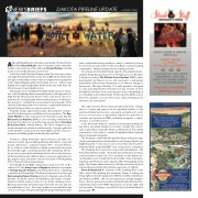 At its height, the NoDAPL camp held as many as 10,000. In De- cember 2016, the Army Corps of Engineers denied an easement to Energy Transfer Partners preventing them from completing construction of the pipeline. The Corps promised to do a thorough Environmental Impact Study and look for alternate routes for the pipeline. As winter came to North Dakota, the leaders of Stand- ing Rock told the water protectors to go home, claiming victory. But many knew that the battle may have been won but the war was definitely not over. The camp’s numbers have dwindled, but close to 1,000 have remained, through freezing temperatures, bliz-